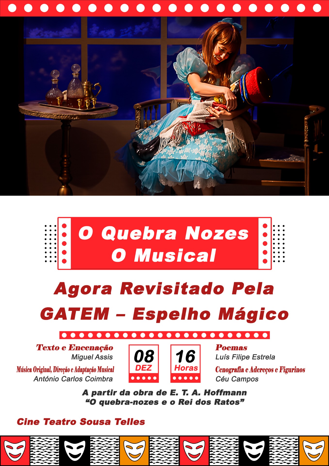 O clássico Conto que encanta as famílias de todo o mundo há muitas gerações, vivificado inúmeras vezes em bailado, é agora revisitado pela GATEM – Espelho Mágico para comemorar o 20º aniversário e 30 produções de teatro musicado para toda a família… Na noite de Natal, no meio da azáfama dos preparativos para a consoada, da chegada da tia Rafaela, da agitação dos criados e do mau humor do mordomo Rodolfo, os jovens Clara e Fritz, recebem do seu adorado padrinho uma prenda invulgar: um Quebra-nozes…Clara apaixona-se de imediato pelo brinquedo. Fritz por sua vez não lhe acha muita graça e no meio de algumas tropelias, acaba por quebra-lo. Confortada com a promessa do padrinho em consertar o boneco na manhã seguinte, Clara adormece no grande salão e a aventura começa…Um jovem príncipe enfeitiçado… Uma aventura mágica para o libertar …